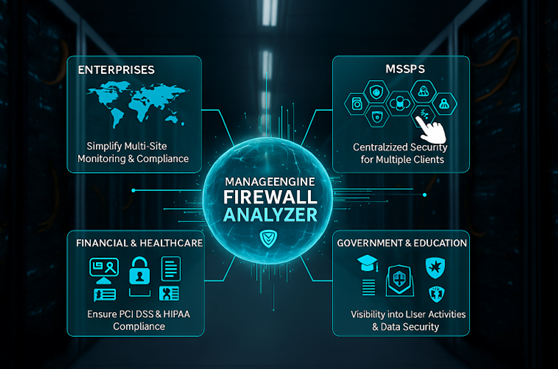 ManageEngine Firewall Analyzer is een bekroonde, agentloze tool voor loganalyse en configuratiebeheer die organisaties helpt bij het monitoren, analyseren en optimaliseren van hun firewall-, proxy-, VPN- en IDS/IPS-apparaten. Het biedt IT- en securityteams bruikbare informatie om de beveiligingspositie te versterken, compliance te waarborgen en netwerkprestaties te maximaliseren.