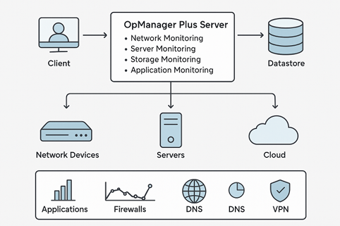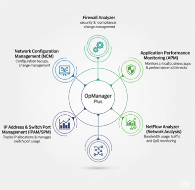 OpManager Plus is een uitgebreide IT Operations Management (ITOM) suite die netwerkbewaking, serverbeheer, applicatieprestaties, beveiligingsanalyse en verkeersmonitoring samenbrengt in één geïntegreerd platform. Ontworpen voor moderne IT-teams, helpt het bij het voorkomen van storingen, het optimaliseren van prestaties en het waarborgen van compliance, terwijl het het aantal tools en operationele kosten vermindert.